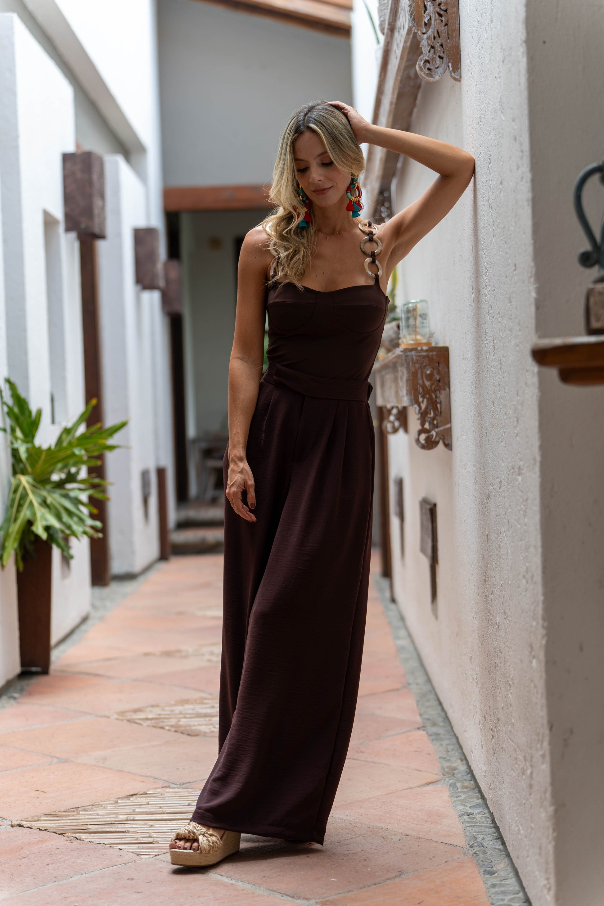 Body en licra mate tipo bustier, con apliques en tiras de aros decorativos. Una pieza sofisticada y versátil para elevar cualquier look.