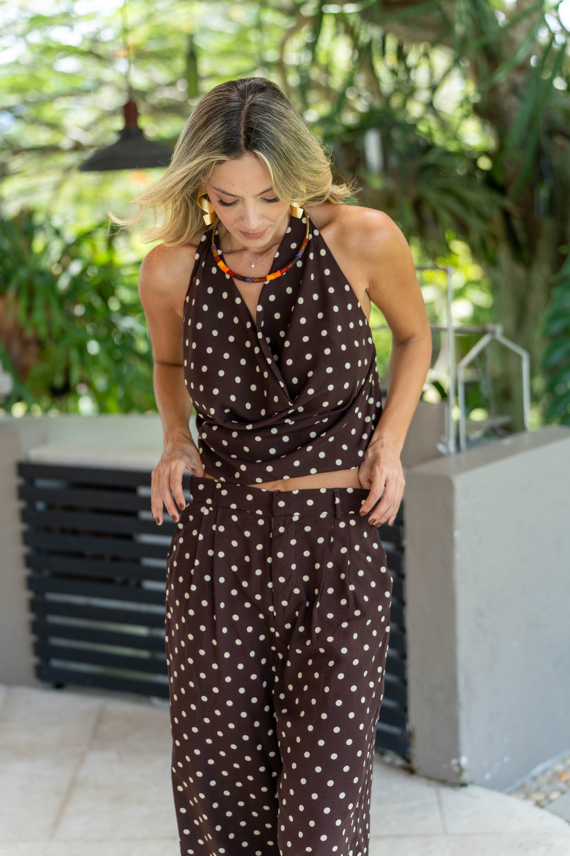 Set de pantalón de prenses y blusa tipo halter en tela estampada de lunares color chocolate !